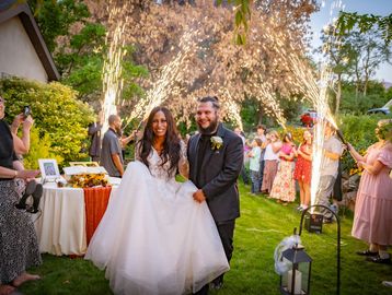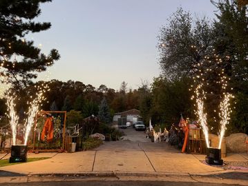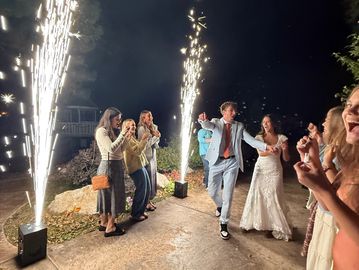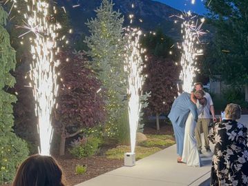 The handheld cold Spark wands put the traditional sparkler exit to shame. They are much safer too. Each handheld unit sprays approximately 10-12 ft and lasts for 20 seconds.