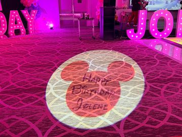 Project custom logos for your business or event on walls, ceillngs, or ground surfaces. We can project a static image or set the image to rotate to catch more attention. $100 for daily rental with discounts for extended use.